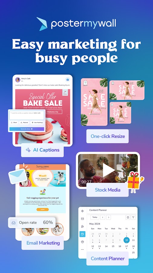 PosterMyWall — отличное приложение для создания баннеров, афиш, промо и постов. Ориентировано на маркетинг, мероприятия и рестораны.