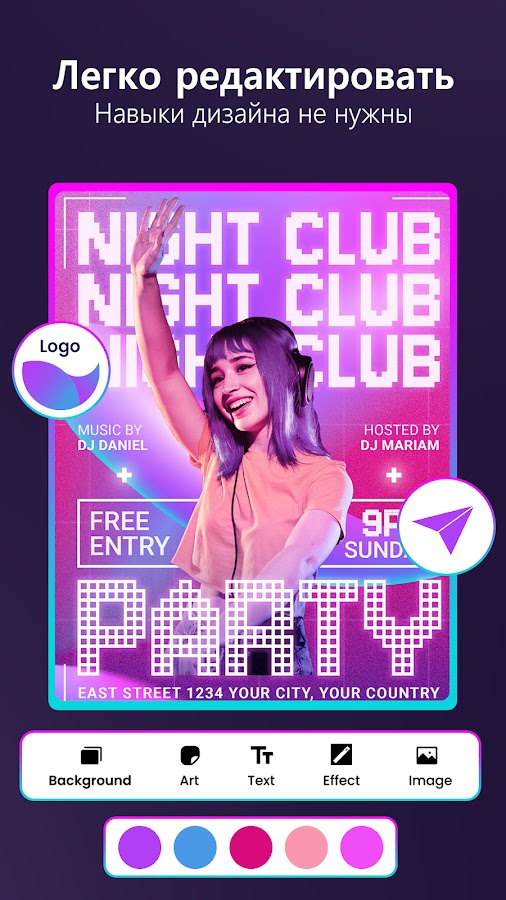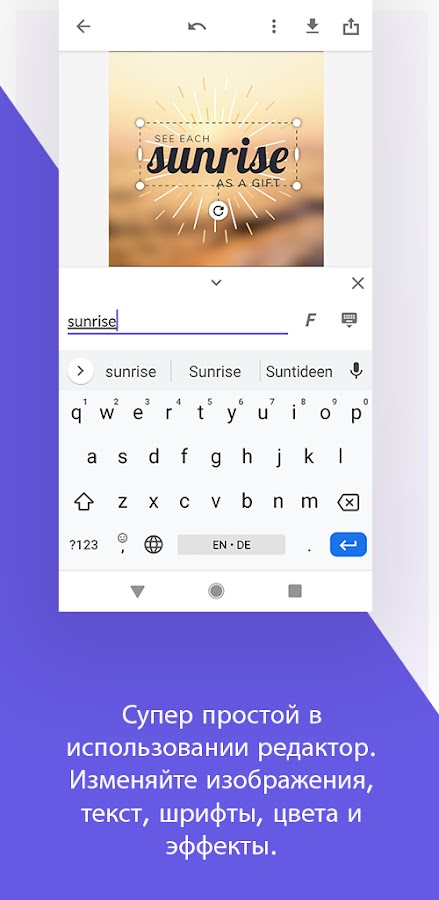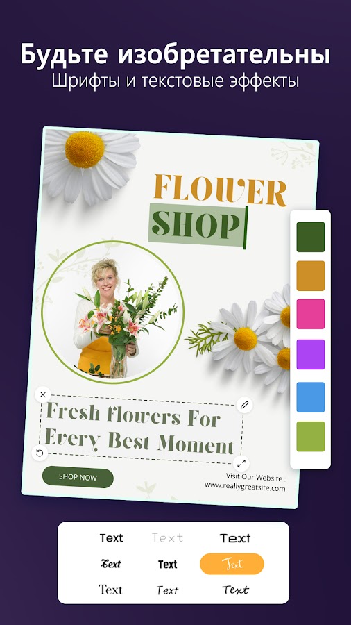 Poster Maker — простое, но мощное приложение для создания афиш, плакатов, баннеров и визиток. Отличается большим выбором шрифтов и фонов.