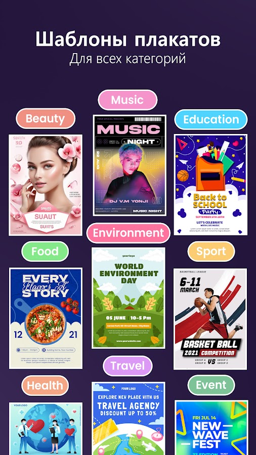 | Poster Maker | Афиши, флаеры, постеры | Готовые шаблоны, ручная настройка шрифта, фона и цвета | Прост в освоении |