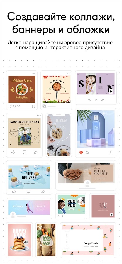 Canva — это, без преувеличения, король мобильного дизайна. Приложение позволяет создавать обложки, баннеры, логотипы, визитки, сторис, флаеры и даже презентации.