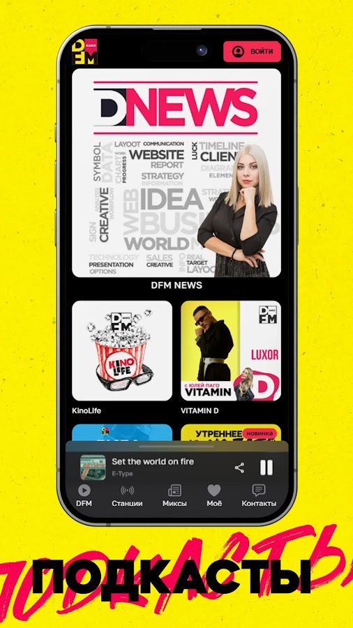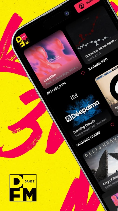 Радио DFM — радио-приложение с фокусом на клубную, электронную и танцевальную музыку. Оно предлагает прямые эфиры, чарты и эксклюзивные DJ-сеты.