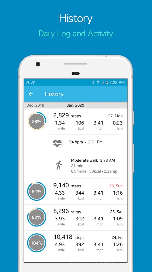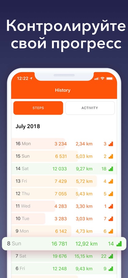 - Подробная статистика шагов, расстояния и калорий