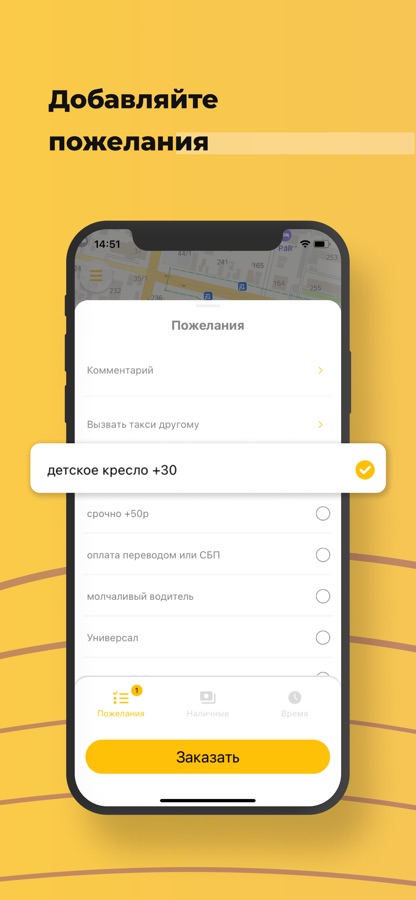 Добавьте к заказу дополнительные пожелания. Например, если едете с ребенком — выберите «детское кресло». Если едете большой компанией — укажите «Минивен», и к вам приедет вместительный автомобиль.
