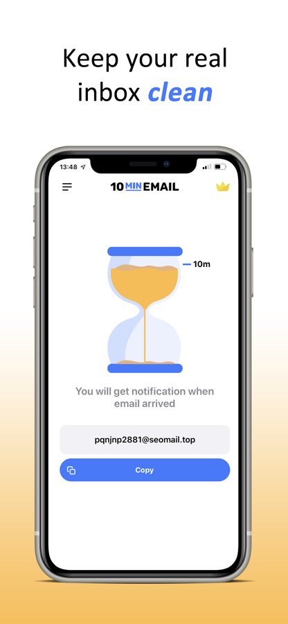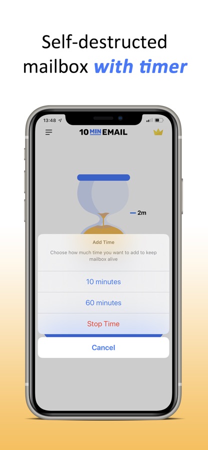Instantly generate a disposable temporary email address that self-destructed after 10 minutes. The concept of temp mail perfectly visualized with an hourglass in a brand new app.