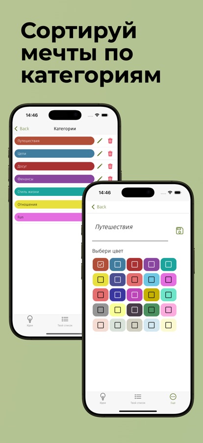 Упорядочивай желания и цели по категориям, таким как путешествия, забота о себе и другим. Оставайся мотивированным, отмечая каждый этап с этим мощным приложением для целей.