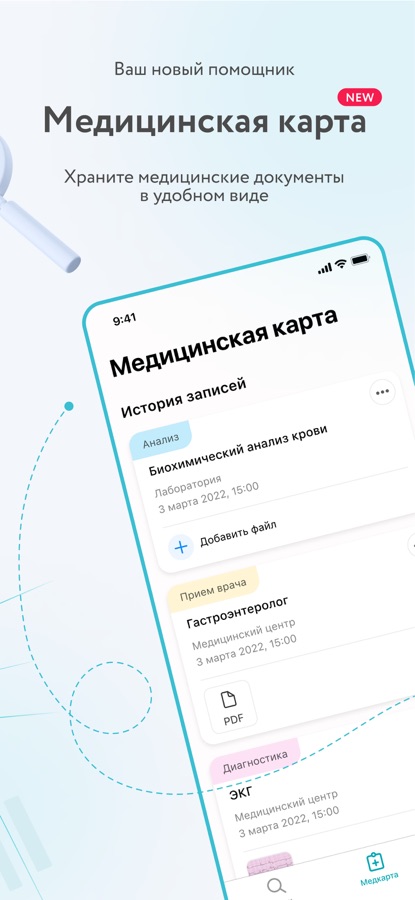 Удобное хранение результатов обследований, заключений врача и других медицинских документов. Вся ваша медицинская история будет храниться в упорядоченном формате и находится всегда под рукой.