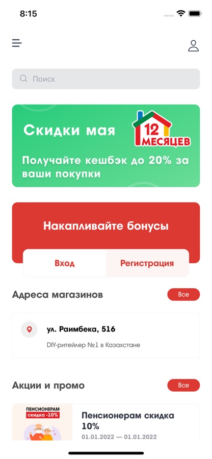 Мобильное приложение для строительного магазина. В данном мобильном приложении действует Программа Лояльности. За каждую совершенную покупку на кассе в магазине пользователю начисляется соответствующий процент бонусов. Также пользователь может ознакомиться с актуальными Промо и Акциями магазина.
