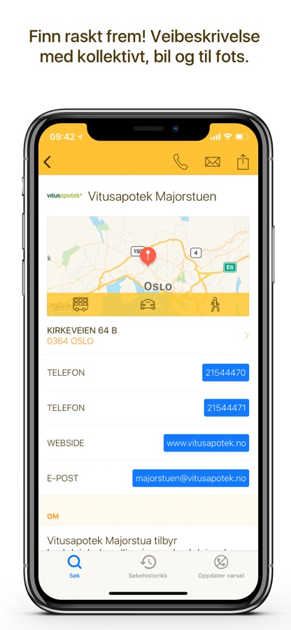 Er du på et sted du ikke er kjent og har litt vondt i hodet? Åpne appen, velg «Apotek» og sorter på «I nærheten» da finner du apotek i nærheten — de har det du trenger. Veibeskrivelse er knyttet til alle bedrifter, så det er lettere å finne frem. For enklere valg vises også firmalogo i søkeresultat.