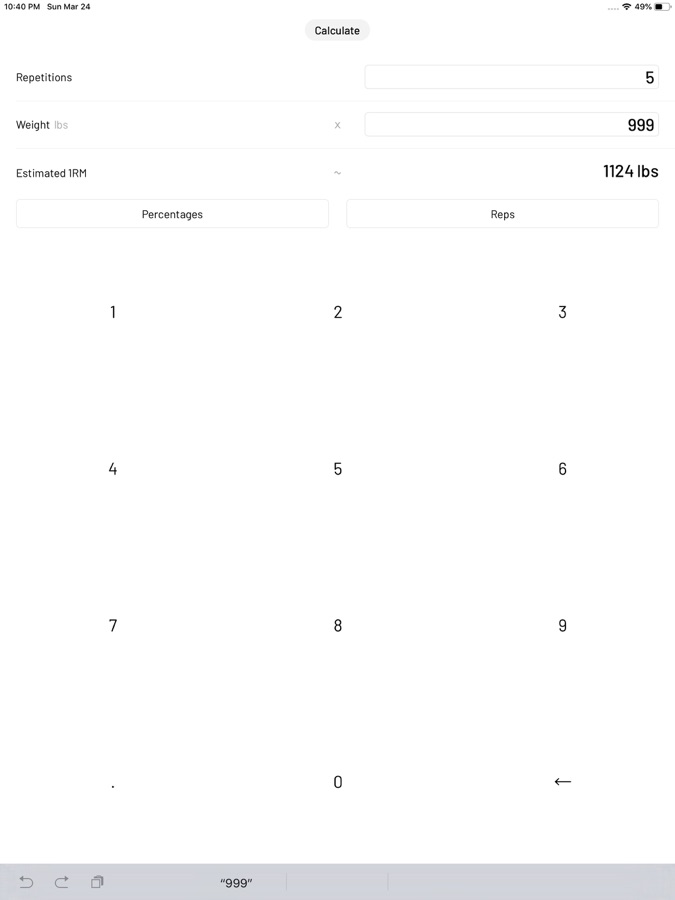 This not only helps give you an idea of the weight to attempt when actually performing a 1-rep max but also to gauge your strength and compare different rep schemes performed at different reps. If one week you were able to bench press 190 lbs at 6 reps and the next week you did 200 for 5, this app gives you a way to compare the two as best as possible (190 lbs @ 6 reps gives a 1-rep max estimate of 223 lbs vs. 200 lbs @ 5 reps gives a 1-rep max estimate of 227 lbs)
