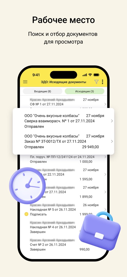 • просмотр входящих и исходящих электронных документов, используя удобные фильтры