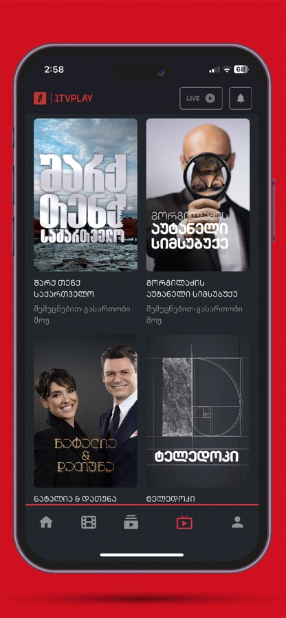 Introducing the newly redesigned and refreshed 1TVPLAY app by the Georgian Public Broadcaster. Experience the ultimate video-on-demand (VOD) platform, now upgraded to BVOD (Broadcasting Video on Demand). Discover a wide range of entertaining content, from movies and TV shows to live broadcasts, tailored to suit your preferences.