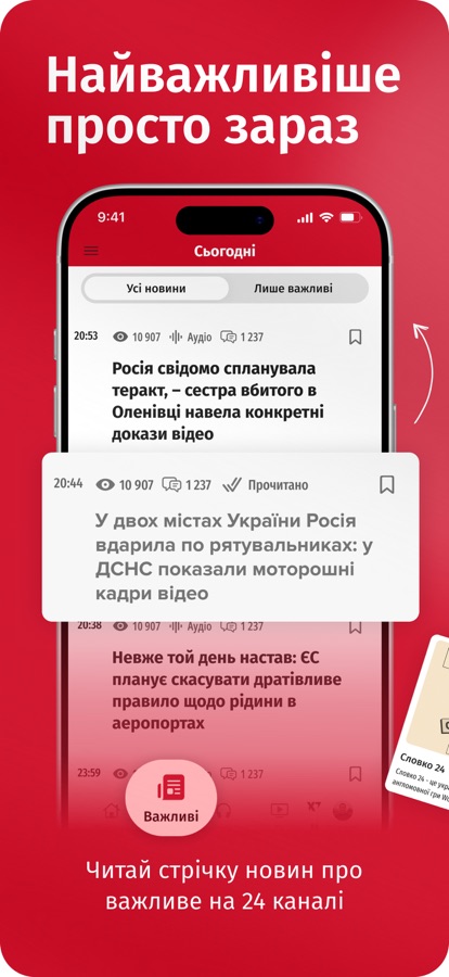 24 Канал – оперативно про головне в Україні та світі. В додатку ви знайдете актуальні новини, інтерв’ю, онлайни важливих подій, якісну аналітику та думки провідних експертів. Сюжети нашого телеканалу та безліч матеріалів, підготованих редакцією сайту, тепер доступні на вашому смартфоні та планшеті. Також, ми постійно проводимо опитування читачів на актуальні теми та готуємо тести і спецпроекти.