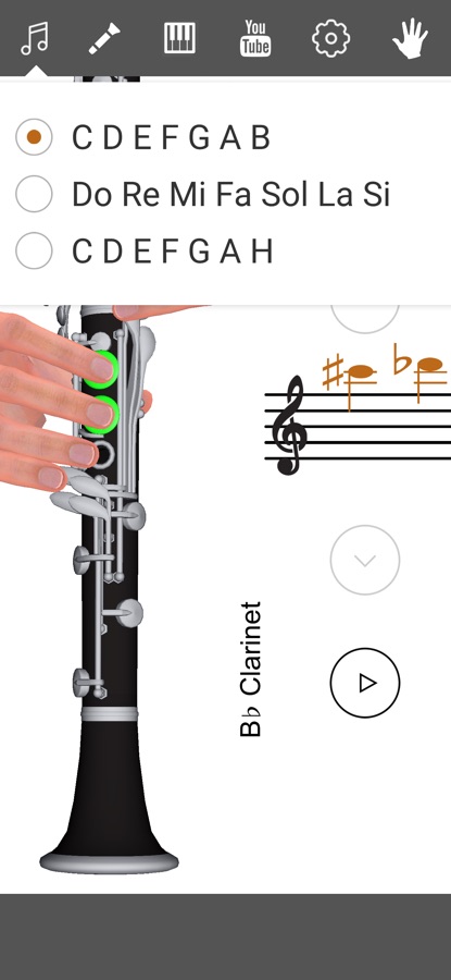3D Аппликатура кларнета покажет вам расположение пальцев на инструменте. Вы узнаете как играть на кларнете каждую ноту. Присутствует демонстрация 3D моделей, поэтому вы сможете научиться как играть на кларнете. Существует раздел уроки кларнета. Можно выбрать разные системы обозначения нот, разные типы и виды кларнетов: кларнет in C, кларнет in B, кларнет in A.