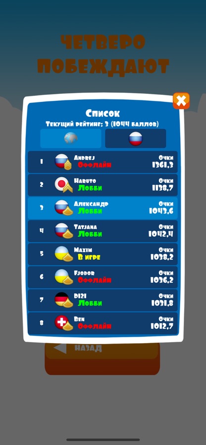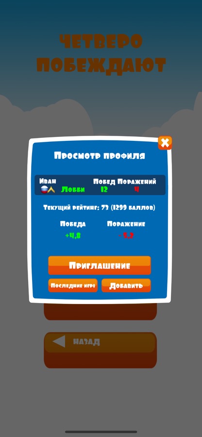 Мы надеемся, тебе понравилось наше приложение „4 побеждают»! Если твой отзыв будет негативным, мы все равно будем ему рады. Просто отправь свой комментарий в службу поддержки. Желаем удачи!