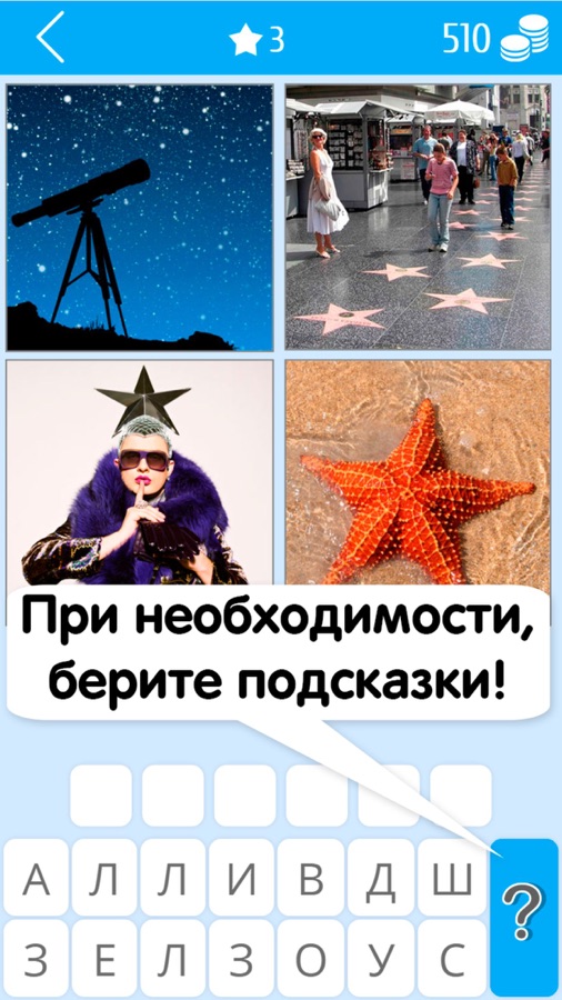 На сложных уровнях чтобы угадать слово по фоткам можно брать подсказки, а также можно попросить помощи у друга или родственника.