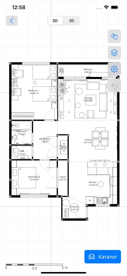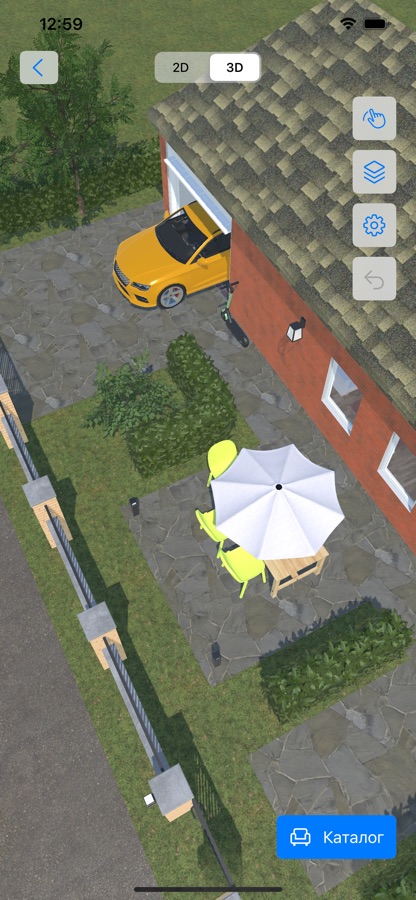 — Нажмите на кнопку каталога внизу, чтобы добавить конструкции, мебель и элементы для открытых пространств, а также выбрать материалы;
