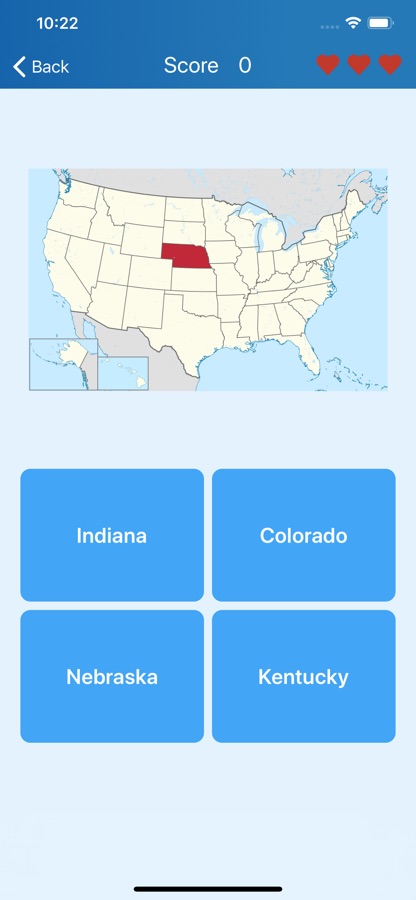 This app is perfect for learning the 50 states of United States of America or for testing your geography knowledge. Several game modes are available: