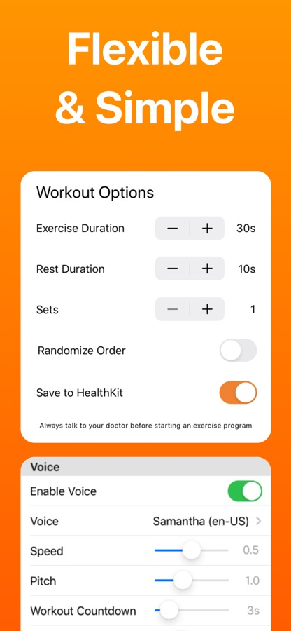 * Voice prompted, so you can complete the entire workout without looking at a timer or device.