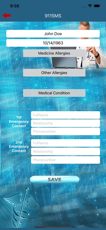 All medical history data is at your discretion… this is a totally opt in solution. You can enter as much information, or as little as you wish. None of your medical history is saved in a database or the cloud….only in your mobile phone. Only you, with a password, can add, edit or view any of the information saved in your 911sms™ mobile app. We do not store or have access to any of the information that you save, including your password.