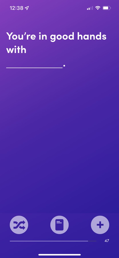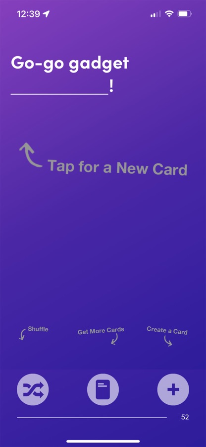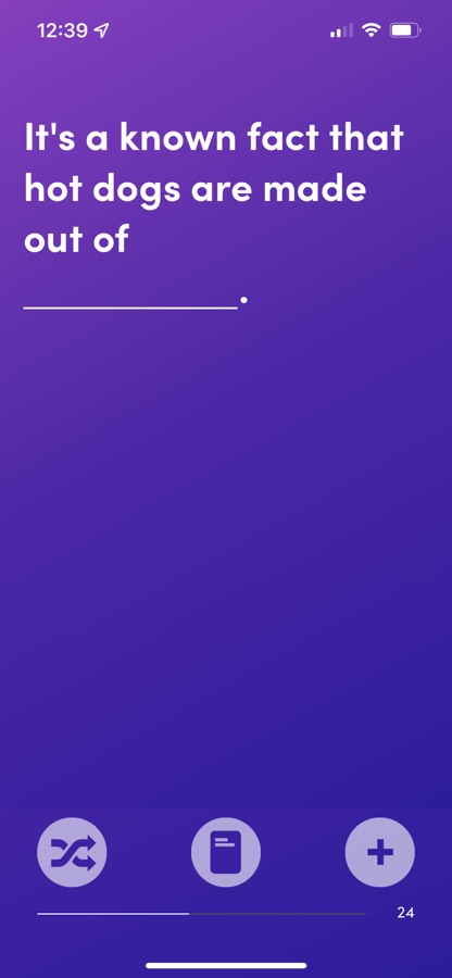 ____ Cards has a simple interface designed for maximum visibility and ease of use. Simply tap the screen for a new card when it’s your turn. Read the card aloud and let users fill in the blank with the cards in their hand.