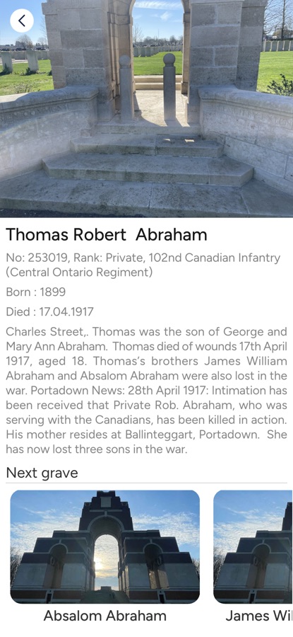 Introducing our Call to Arms app, your comprehensive guide to the poignant battlefields of the Somme and Flanders. This innovative mobile app helps you identify and discover the countless war graves and cemeteries scattered across these historic regions. Uncover the stories of brave soldiers buried there through images and detailed textual content.
