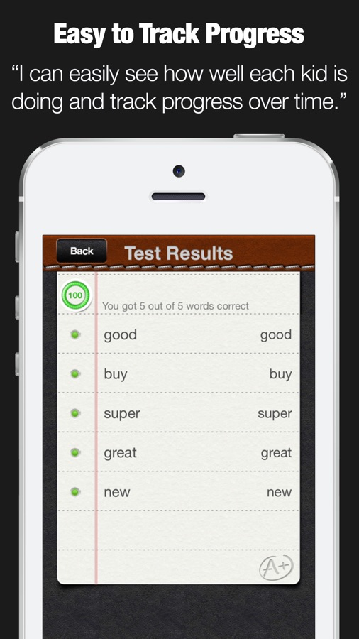 — Track your kids progress and quickly see how they are doing for each test they took as well as which words if any they are struggling with.