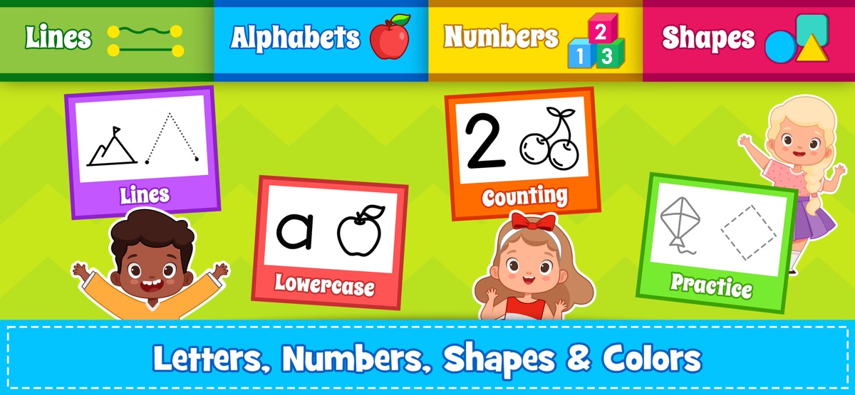 Best Learning apps for kids with tracing and phonics games. Learning of English letters, numbers, Shapes, curves, slanting lines, straight line, simple lines and free drawings, colors and more other basic vocabulary. Any toddler, kindergartner or preschool age child can learn English and the English alphabet and numbers simply kids tracing letters by following their finger