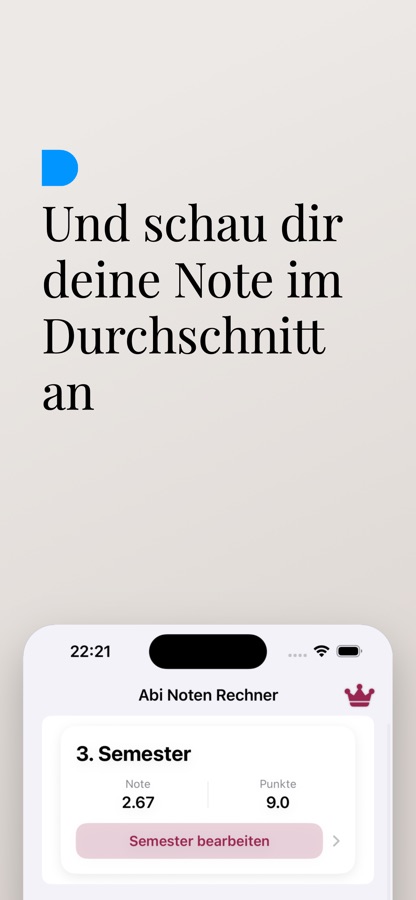 Erfasse deine Semester- und Abiturprüfungen einfach und schnell. Die App berechnet automatisch deine Durchschnittsnoten und zeigt dir die Punktzahlen übersichtlich an.