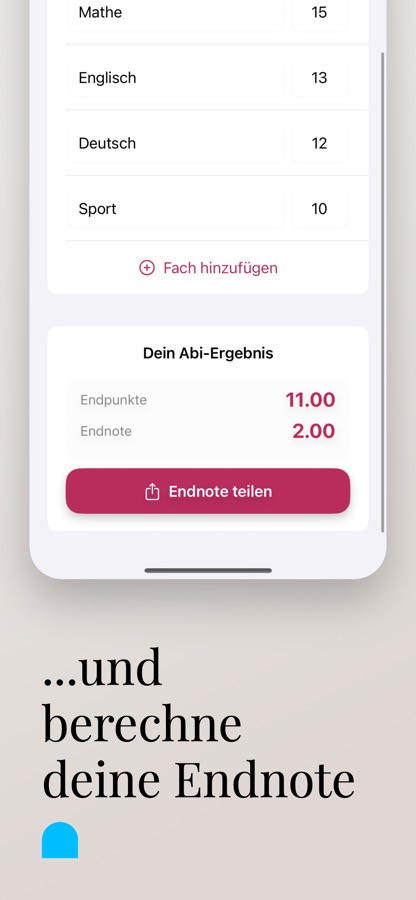 Mit dem Abi Noten Rechner hast du alles in einer App: Berechnung, Planung und Überblick – ideal für Schüler:innen, die ihr Abi gezielt gestalten wollen!