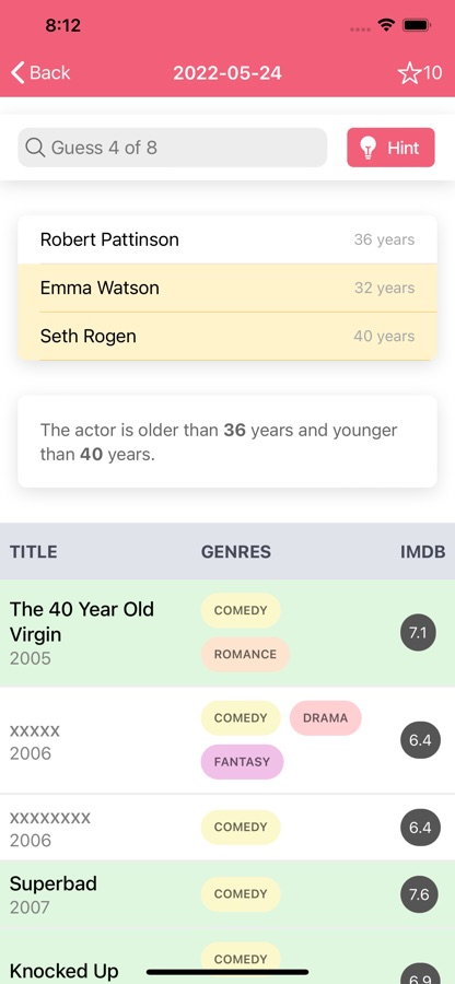 Explore actors based on their filmography and get hints about their age as you level up. Guess the actors for movie titles and witness your cinematic knowledge expand with each level.