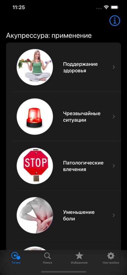 Приложение содержит более 90 комбинаций точек, которые могут использоваться в различных ситуациях, например, для облегчения головной боли, чтобы бросить курить, чтобы снизить высокое давление и т.д. Все комбинации разделены на следующие группы: