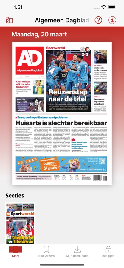 De AD — Digitale krant app is de papieren krant, maar dan op je beeldscherm. De app bevat alle regionale edities van vandaag en een archief vol oudere kranten.