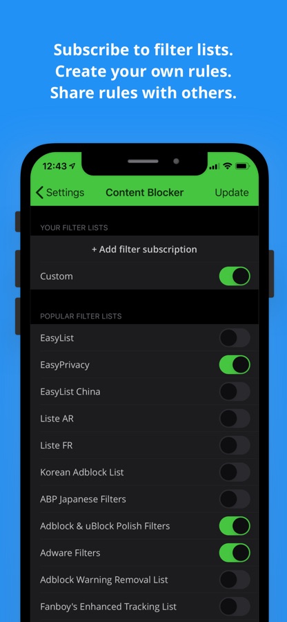 • AdBlock automatically updates to the latest version of the filters on every app run. We keep the ad servers database up-to-date for you.