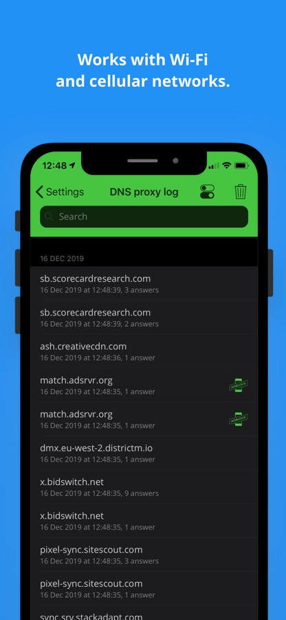 • AdBlock comes with a local DNS proxy service built-in. Use it to see which domains you’re device is contacting. Create your own rules and assign any IP to any domain, right on your device. You can (and should!) bootstrap this feature with rules found online.