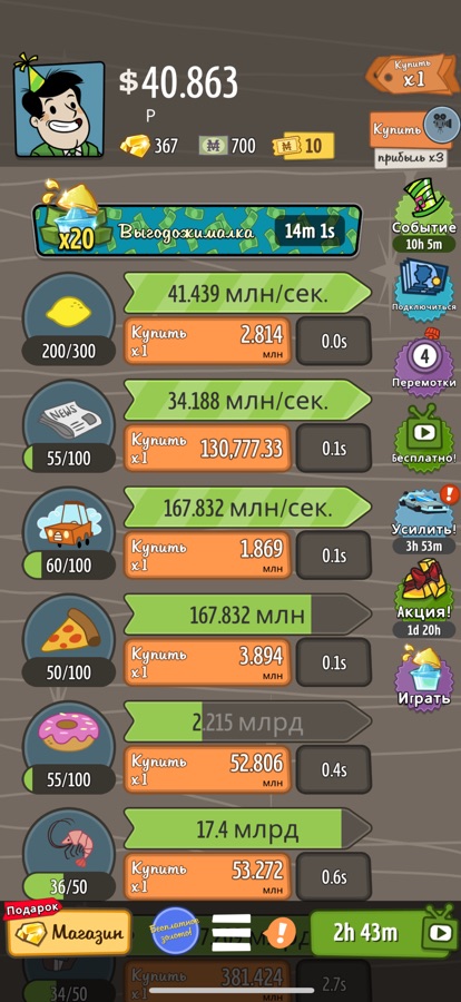 Догоняйте и опережайте конкурентов, инвестор! Покупайте в магазине золото, перемотки или особых менеджеров, которые помогут увеличить прибыль.