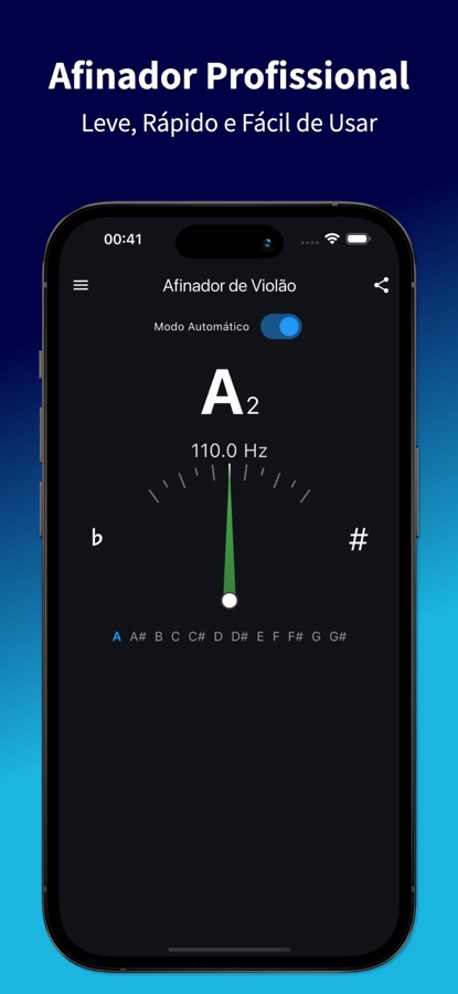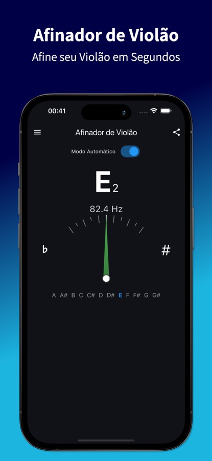 Nosso aplicativo foi feito exclusivamente para afinar violão. Assim, o aplicativo fica super leve, rápido e fácil de usar.