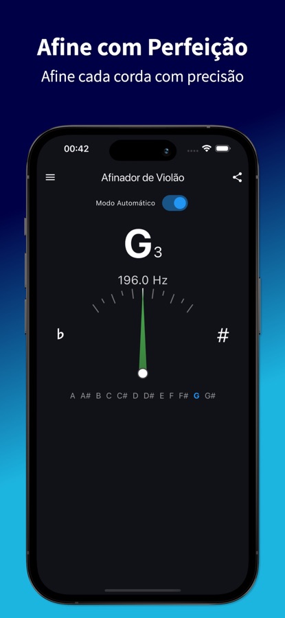 Afine seu violão em segundos com facilidade e precisão! Nosso afinador profissional inteligente é perfeito tanto para iniciantes quanto para músicos profissionais. Com detecção automática de notas, você pode afinar rapidamente sem complicações. O modo manual permite a afinação de cada corda manualmente.
