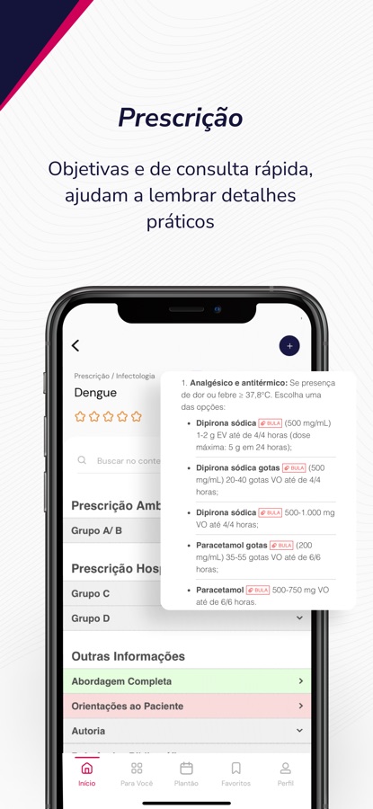 * Medicamentos e Bulário: informações para prescrever medicamentos com segurança: posologia, nomes comerciais, classes terapêuticas, uso clínico, geriátrico e pediátrico, contraindicações e mais. São mais de 3 mil medicamentos!