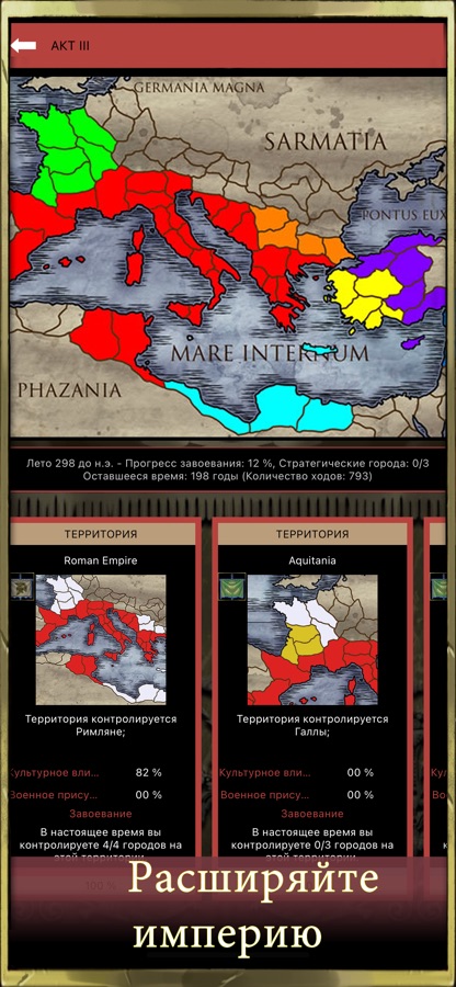 — пошаговая стратегическая игра: применяйте лучшие стратегии для управления империей, отслеживая в ходе игры наиболее значимые события в истории Рима.