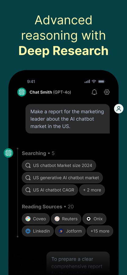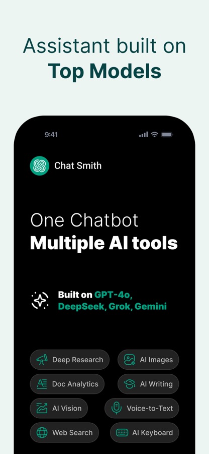 Chat Smith — ваш ИИ-ассистент нового поколения, созданный для глубокого мышления и быстрого творчества. Приложение работает на базе самых продвинутых моделей: Claude Sonnet 4.6, Claude Haiku 4.5, GPT-5.2, GPT-5, GPT-4, GPT-4o, Gemini 3, DeepSeek и Grok-4. Chat Smith сочетает человеческую логику с мощными возможностями ИИ-чата.