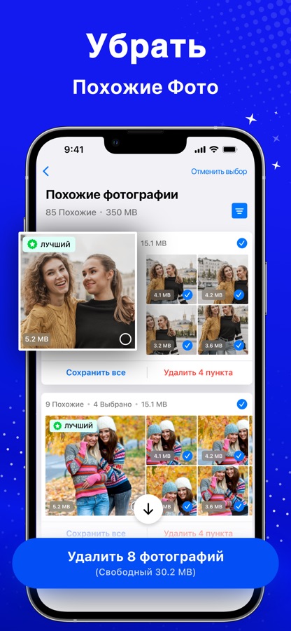 — Сканирование библиотеки фотографий для обнаружения и удаления похожих фотографий, дубликатов фотографий, похожих снимков экрана, похожих селфи, больших видео, и похожих серийных фотографий