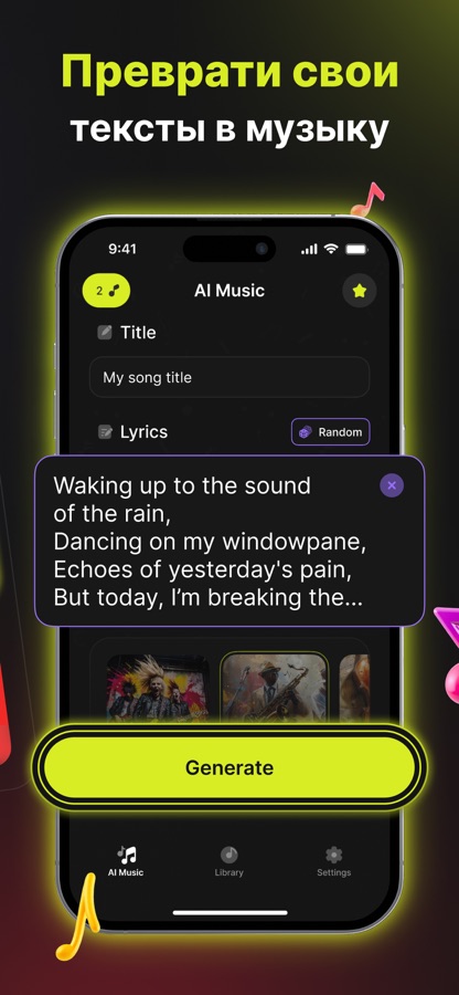 • Нажмите кнопку генерации и уже через секунды наслаждайтесь уникальной песней, созданной AI!