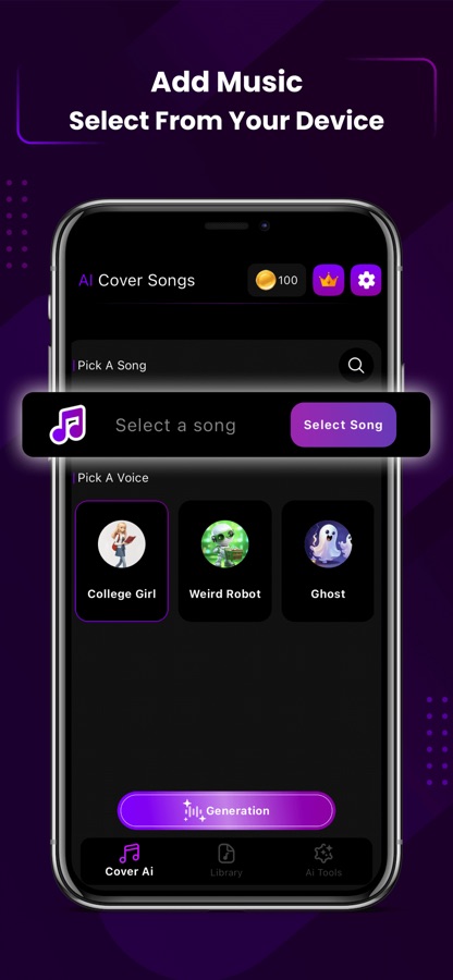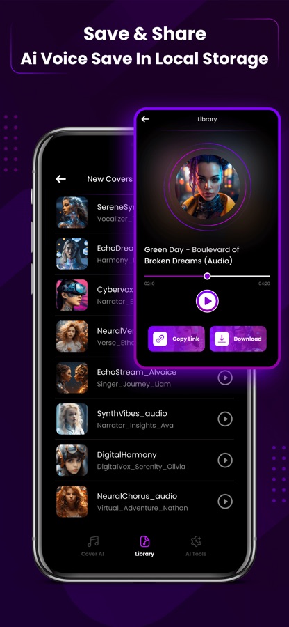 AI Cover Songs & AI Music with you can convert a song into an AI Cover song and save it with just a simple tap. AI Cover Songs & AI Music also allows the option of creating AI music using different prompts and different audio playing libraries, like pop, rap, rock, and many more. Save all your created music and AI cover songs to the library and share them with your friends. Unleash your creativity, write and sing whatever you want, and transform it into AI music.