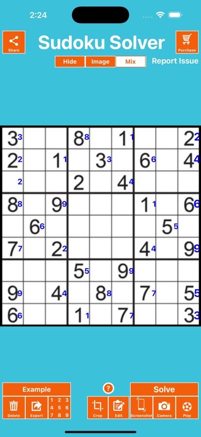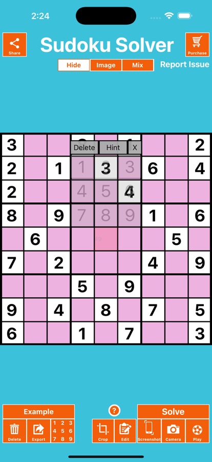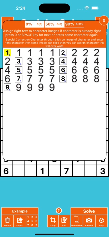 ◆ В режиме камеры вам нужно сфотографировать судоку с помощью приложения, затем обрезать и проверить персонаж.