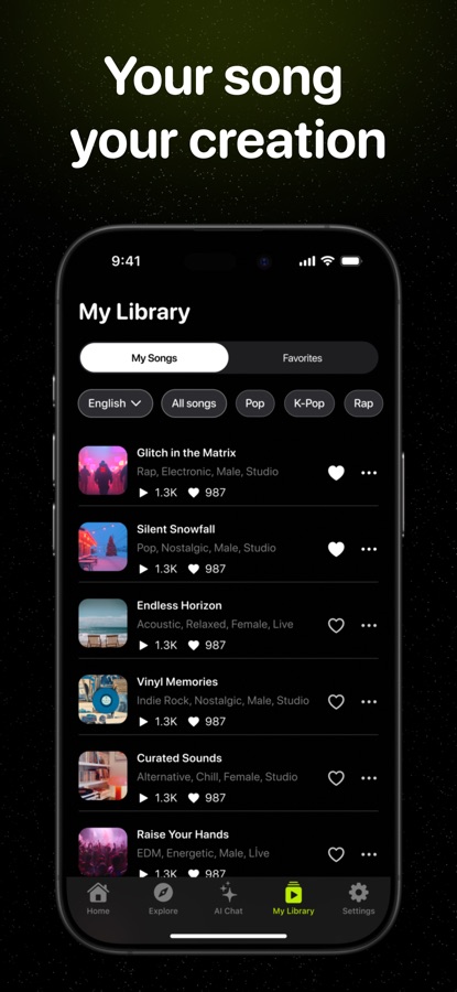 With AI Music Generator, you can compose unique songs in just a few taps. Our advanced AI technology assists you in crafting the perfect melody and harmony to match your creative vision.