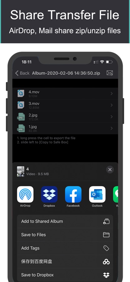 [Share & export file]: распакованные файлы и сжатый файл можно разделить с друзьями из AirDrop, электронной почты и других APP.