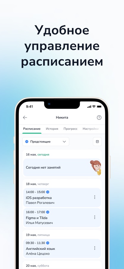 ● управляйте расписанием — составляйте удобный график, переносите уроки, записывайтесь на отработки;