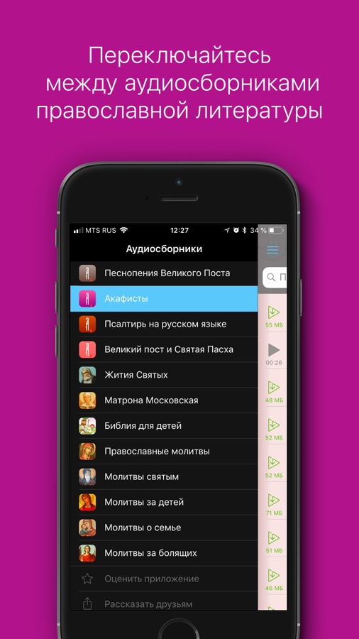 ・Легкое переключение между православными тематическими аудиосборниками через выпадающее меню;