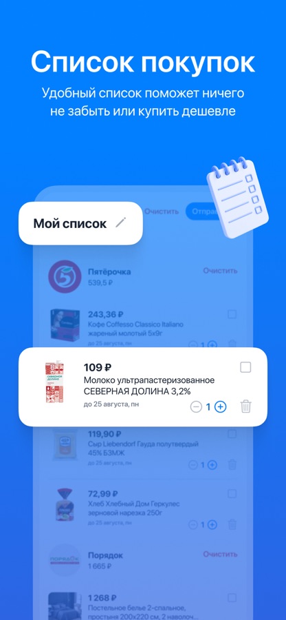 Умные списки покупок – создавайте списки продуктов и товаров, которые вам нужны. Приложение автоматически подскажет, где эти товары сейчас дешевле всего, и отметит акционные позиции и дисконт.