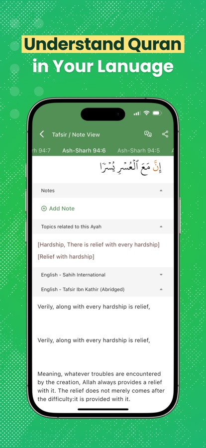 Поймите Коран на своем языке с помощью Тафсира. Слушайте декламации и изучайте пословные значения и грамматику. Ищите, добавляйте закладки, делайте заметки и отслеживайте свой прогресс для более глубокого изучения.